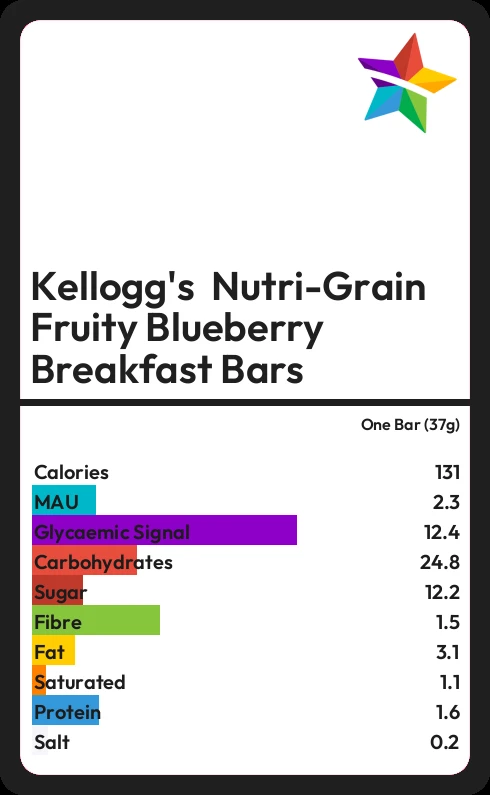 Kellogg's Nutri-Grain Fruity Blueberry Breakfast Bars contains 12.2g sugar in one Bar (37g) - that is around 3 cubes of sugar.