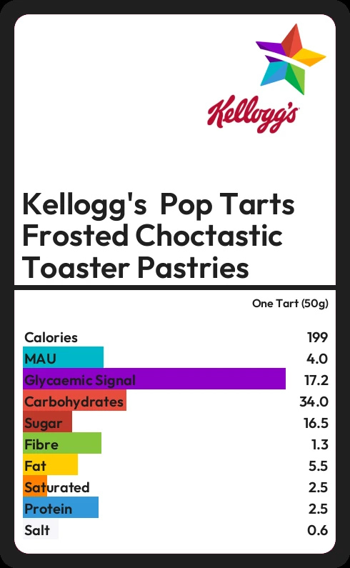 Kellogg's Pop Tarts Frosted Choctastic Toaster Pastries contains 16.5g sugar in one Tart (50g) - that is around 4 cubes of sugar.