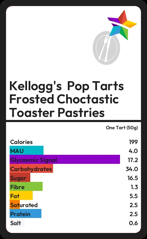 Kellogg's Pop Tarts Frosted Choctastic Toaster Pastries contains 16.5g sugar in one Tart (50g) - that is around 4 cubes of sugar.