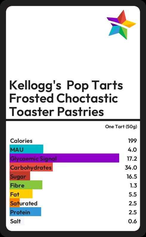 Kellogg's Pop Tarts Frosted Choctastic Toaster Pastries contains 16.5g sugar in one Tart (50g) - that is around 4 cubes of sugar.