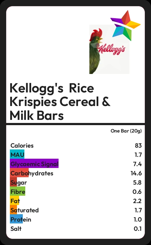 Kellogg's Rice Krispies Cereal & Milk Bars contains 5.8g sugar in one Bar (20g) - that is around 1 cube of sugar.