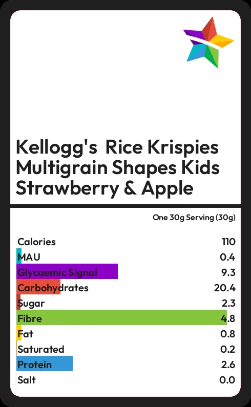 Kellogg's Rice Krispies Multigrain Shapes Kids Strawberry & Apple contains 109.8 calories in one 30g Serving (30g).