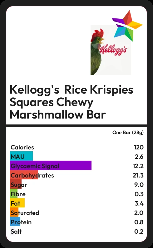 Kellogg's Rice Krispies Squares Chewy Marshmallow Bar contains 9.0g sugar in one Bar (28g) - that is around 2 cubes of sugar.
