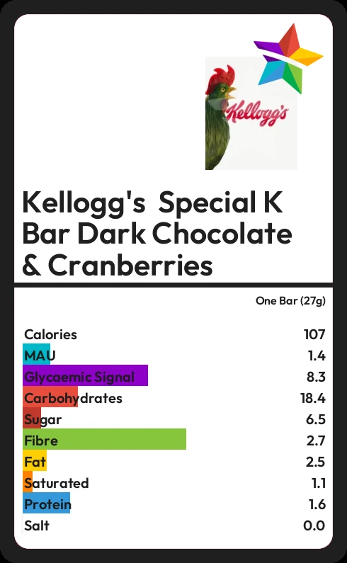 Kellogg's Special K Bar Dark Chocolate & Cranberries contains 6.5g sugar in one Bar (27g) - that is around 2 cubes of sugar.