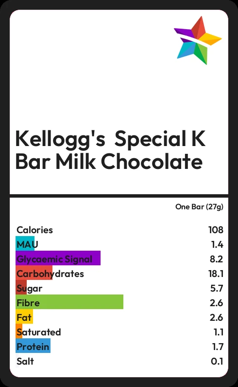 Kellogg's Special K Bar Milk Chocolate contains 108.3 calories in one Bar (27g).