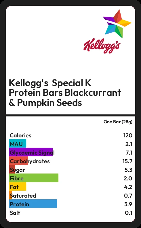Kellogg's Special K Protein Bars Blackcurrant & Pumpkin Seeds contains 119.6 calories in one Bar (28g).