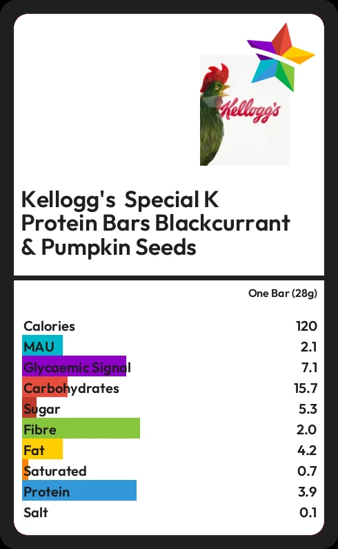 Kellogg's Special K Protein Bars Blackcurrant & Pumpkin Seeds contains 119.6 calories in one Bar (28g).