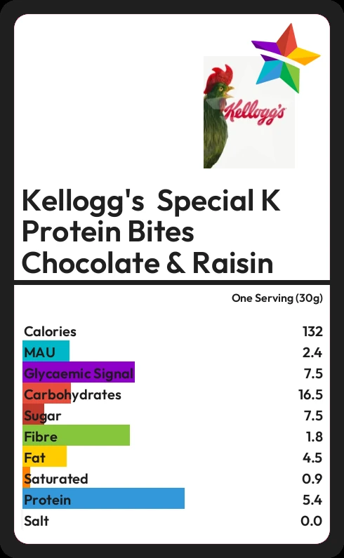 Kellogg's Special K Protein Bites Chocolate & Raisin contains 132 calories in one Serving (30g).