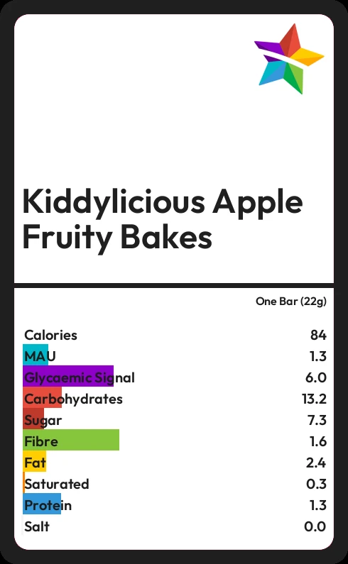 Kiddylicious Apple Fruity Bakes contains 83.8 calories in one Bar (22g).