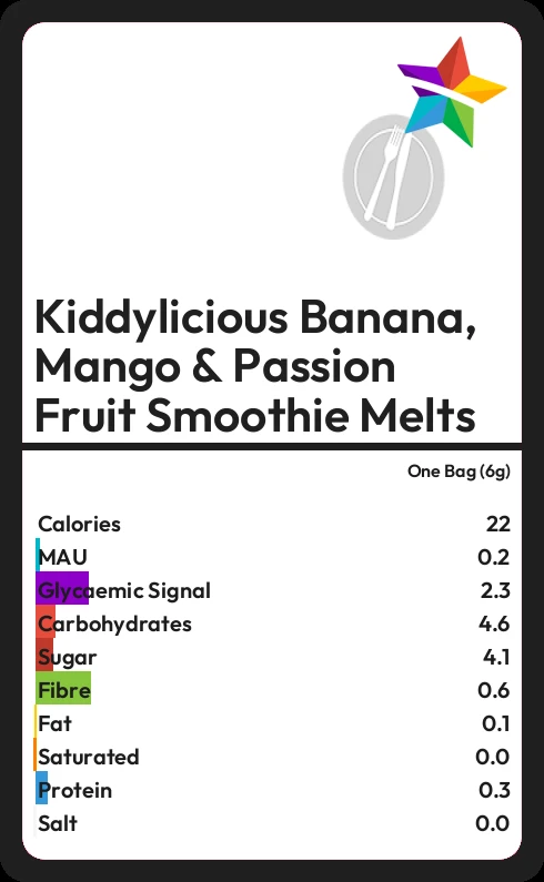 Kiddylicious Banana, Mango & Passion Fruit Smoothie Melts contains 21.7 calories in one Bag (6g).