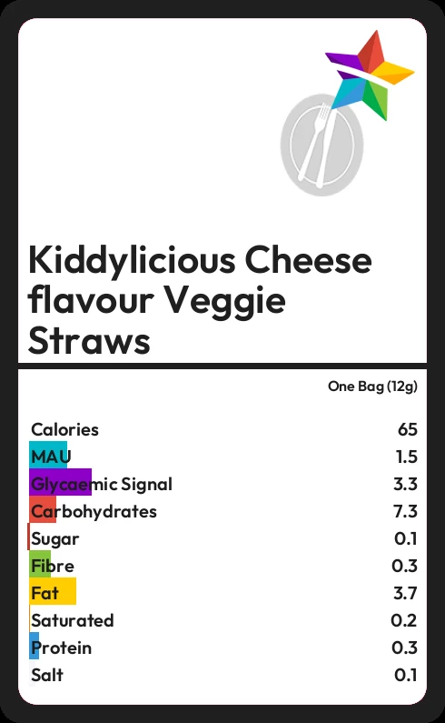 Kiddylicious Cheese flavour Veggie Straws contains 64.7 calories in one Bag (12g).