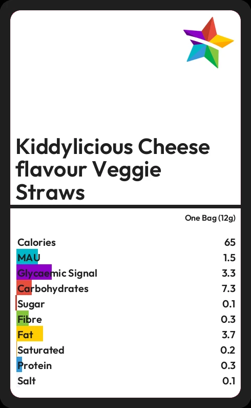 Kiddylicious Cheese flavour Veggie Straws contains 0.1g sugar in one Bag (12g)