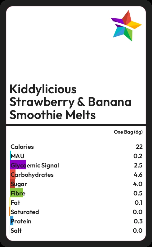 Kiddylicious Strawberry & Banana Smoothie Melts contains 21.7 calories in one Bag (6g).