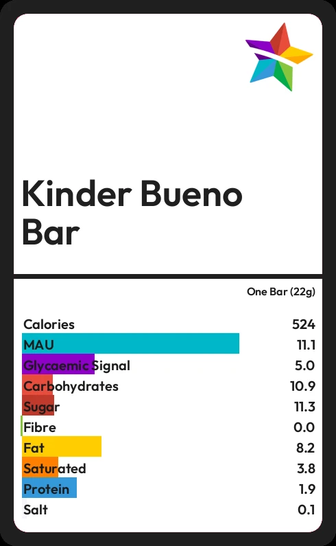 Kinder Bueno Bar contains 11.3g sugar in one Bar (22g) - that is around 3 cubes of sugar.