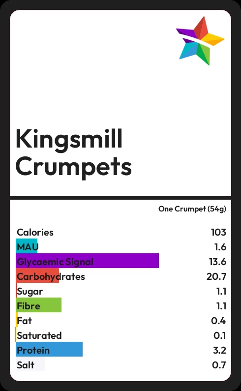 Kingsmill Crumpets contains 103.1 calories in one Crumpet (54g).