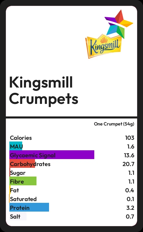 Kingsmill Crumpets contains 1.1g sugar in one Crumpet (54g)