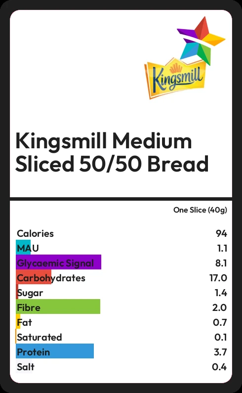 Kingsmill Medium Sliced 50/50 Bread contains 1.4g sugar in one Slice (40g)