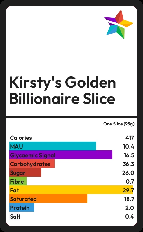 Kirsty's Golden Billionaire Slice contains 26.0g sugar in one Slice (93g) - that is around 7 cubes of sugar.