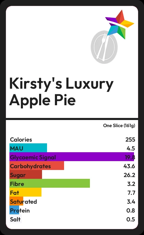 Kirsty's Luxury Apple Pie contains 26.2g sugar in one Slice (161g) - that is around 7 cubes of sugar.