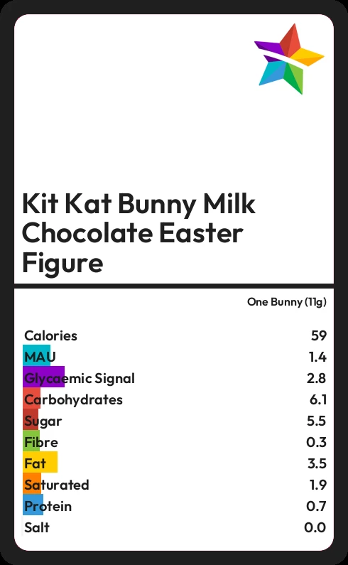 Kit Kat Bunny Milk Chocolate Easter Figure contains 59 calories in one Bunny (11g).