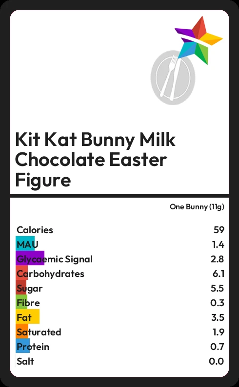 Kit Kat Bunny Milk Chocolate Easter Figure contains 59 calories in one Bunny (11g).