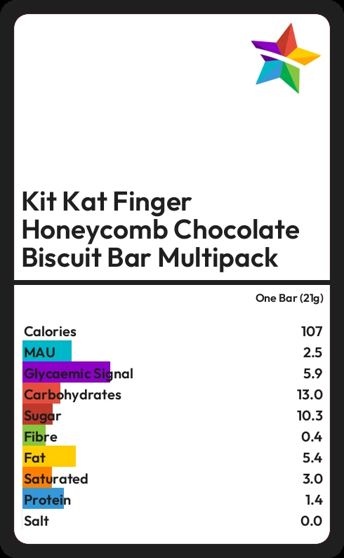 Kit Kat Finger Honeycomb Chocolate Biscuit Bar Multipack contains 10.3g sugar in one Bar (21g) - that is around 3 cubes of sugar.