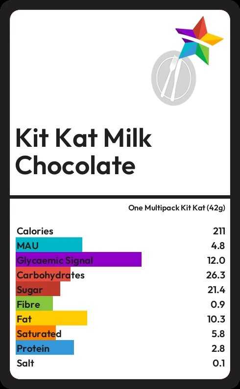 Kit Kat Milk Chocolate contains 21.4g sugar in one Multipack Kit Kat (42g) - that is around 5 cubes of sugar.