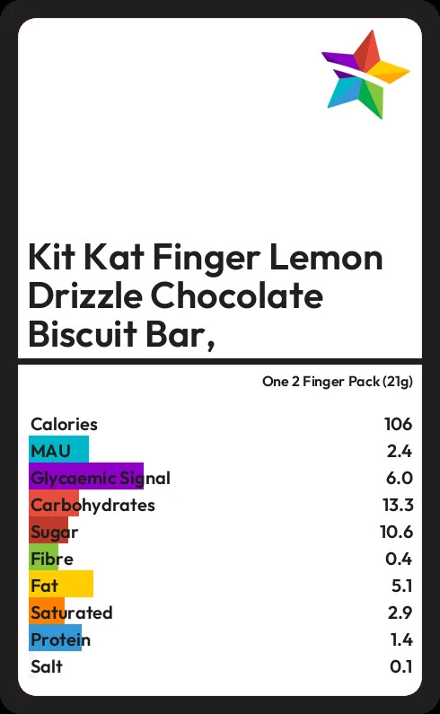 Kit Kat Finger Lemon Drizzle Chocolate Biscuit Bar, contains 106.1 calories in one 2 Finger Pack (21g).