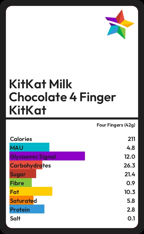 KitKat Milk Chocolate 4 Finger KitKat contains 21.4g sugar in four Fingers (42g) - that is around 5 cubes of sugar.
