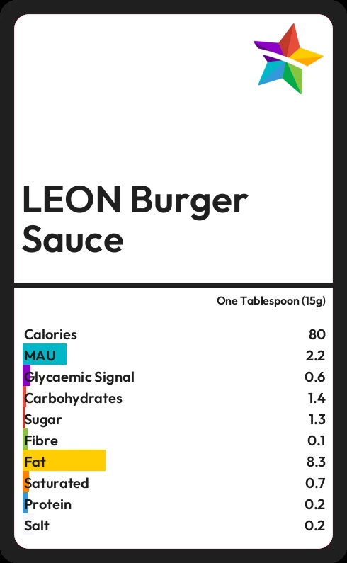In one Tablespoon (15g) of LEON Burger Sauce there are 8.3g of fat of which 0.7g are saturated.
