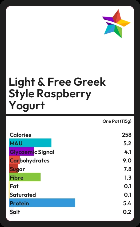 Light & Free Greek Style Raspberry Yogurt contains 7.8g sugar in one Pot (115g) - that is around 2 cubes of sugar.