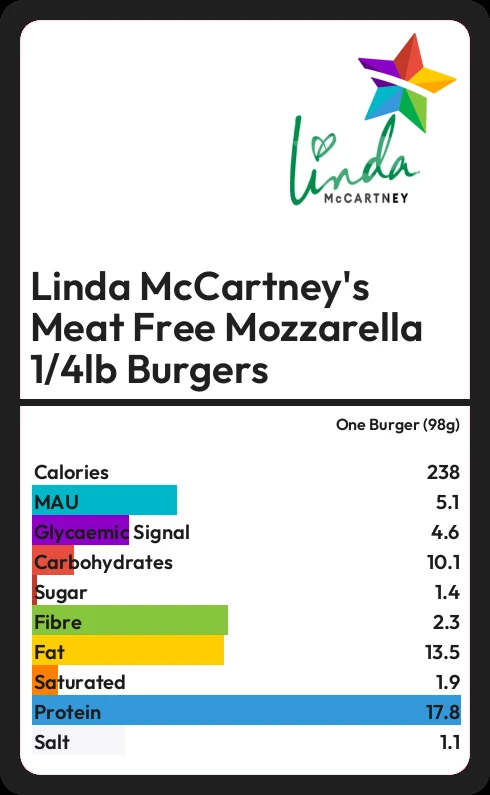Linda McCartney's Meat Free Mozzarella 1/4lb Burgers contains 238.1 calories in one Burger (98g).