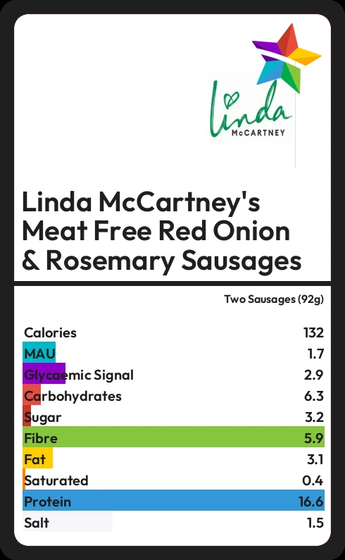 Linda McCartney's Meat Free Red Onion & Rosemary Sausages contains 131.6 calories in two Sausages (92g).