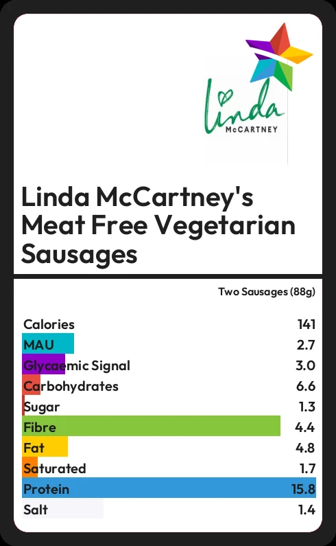 Linda McCartney's Meat Free Vegetarian Sausages contains 1.3g sugar in two Sausages (88g)