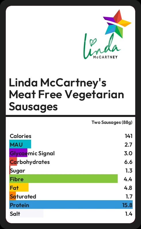 Linda McCartney's Meat Free Vegetarian Sausages contains 1.3g sugar in two Sausages (88g)