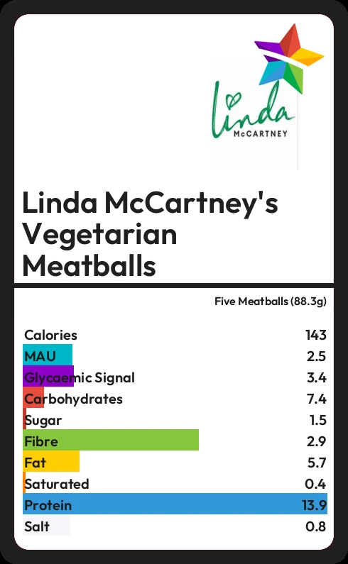 Linda McCartney's Vegetarian Meatballs contains 1.5g sugar in five Meatballs (88.3g)