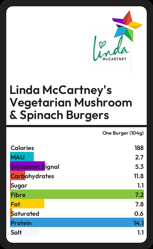 Linda McCartney's Vegetarian Mushroom & Spinach Burgers contains 1.1g sugar in one Burger (104g)