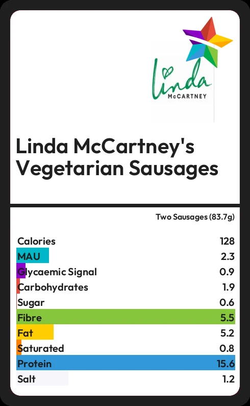Linda McCartney's Vegetarian Sausages contains 0.6g sugar in two Sausages (83.7g)