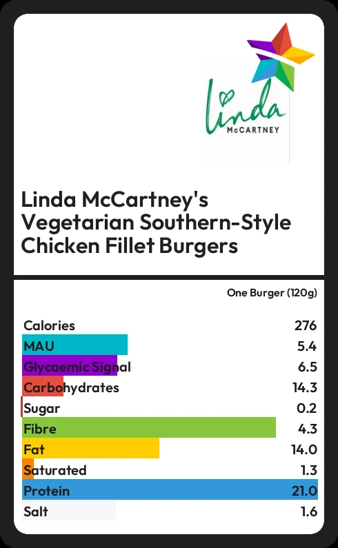 Linda McCartney's Vegetarian Southern-Style Chicken Fillet Burgers contains 0.2g sugar in one Burger (120g)