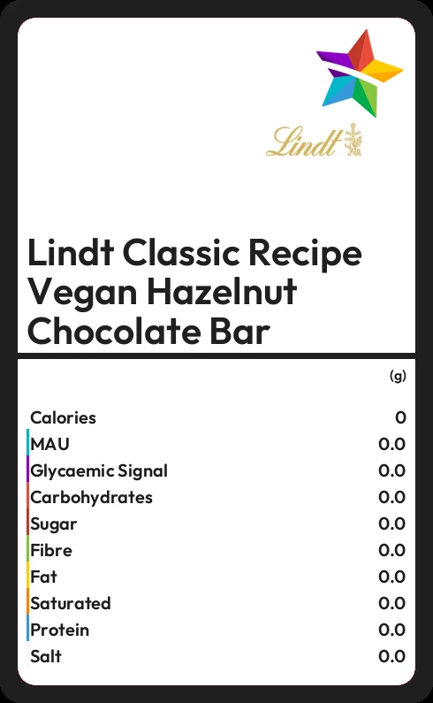 Lindt Classic Recipe Vegan Hazelnut Chocolate Bar contains 38.0g sugar in 100g - that is around 10 cubes of sugar.
