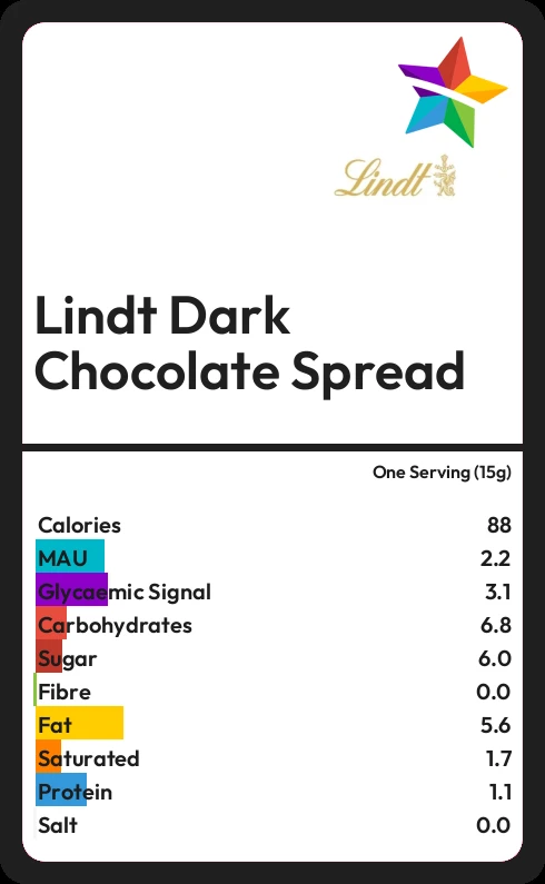 Lindt Dark Chocolate Spread contains 6.0g sugar in one Serving (15g) - that is around 2 cubes of sugar.