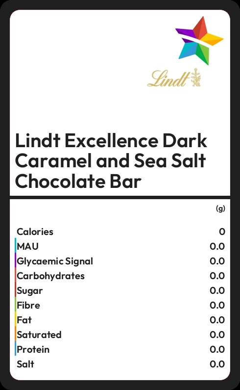 Lindt Excellence Dark Caramel and Sea Salt Chocolate Bar contains 52.0g sugar in 100g - that is around 13 cubes of sugar.