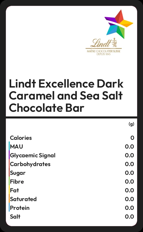 Lindt Excellence Dark Caramel and Sea Salt Chocolate Bar contains 52.0g sugar in 100g - that is around 13 cubes of sugar.