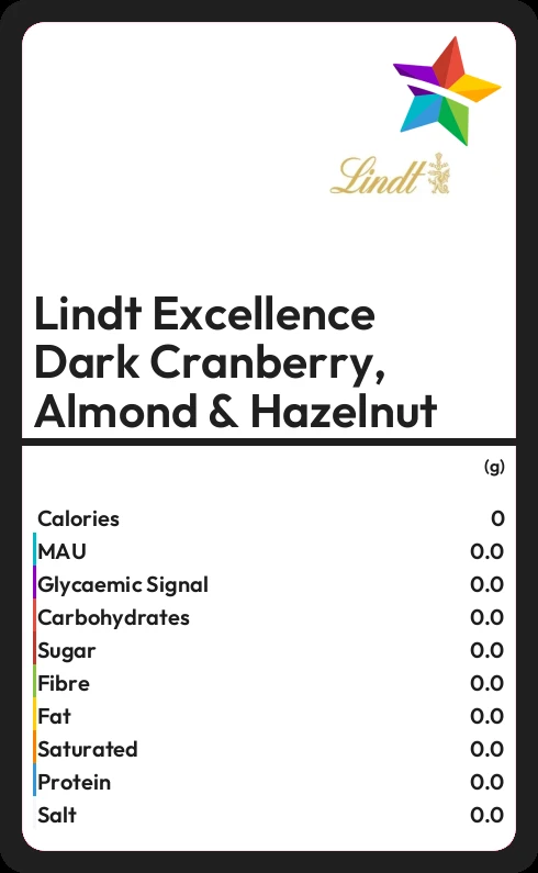 In 100g of Lindt Excellence Dark Cranberry, Almond & Hazelnut there are 30.0g of fat of which 17.0g are saturated.