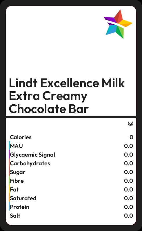 Lindt Excellence Milk Extra Creamy Chocolate Bar contains 50.0g sugar in 100g - that is around 13 cubes of sugar.