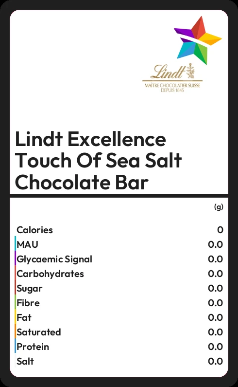 Lindt Excellence Touch Of Sea Salt Chocolate Bar contains 48.0g sugar in 100g - that is around 12 cubes of sugar.
