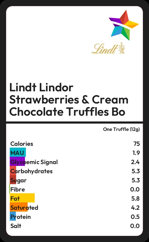 Lindt Lindor Strawberries & Cream Chocolate Truffles Bo contains 5.3g sugar in one Truffle (12g) - that is around 1 cube of sugar.