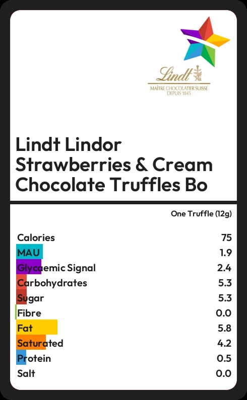 Lindt Lindor Strawberries & Cream Chocolate Truffles Bo contains 5.3g sugar in one Truffle (12g) - that is around 1 cube of sugar.