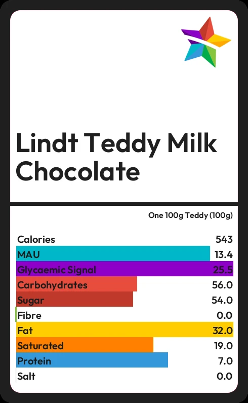 Lindt Teddy Milk Chocolate contains 543 calories in one 100g Teddy (100g).