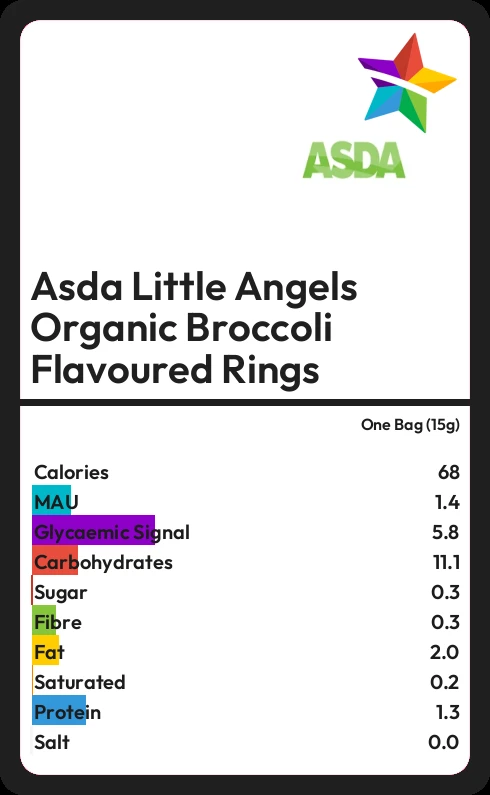 Asda Little Angels Organic Broccoli Flavoured Rings contains 0.3g sugar in one Bag (15g)